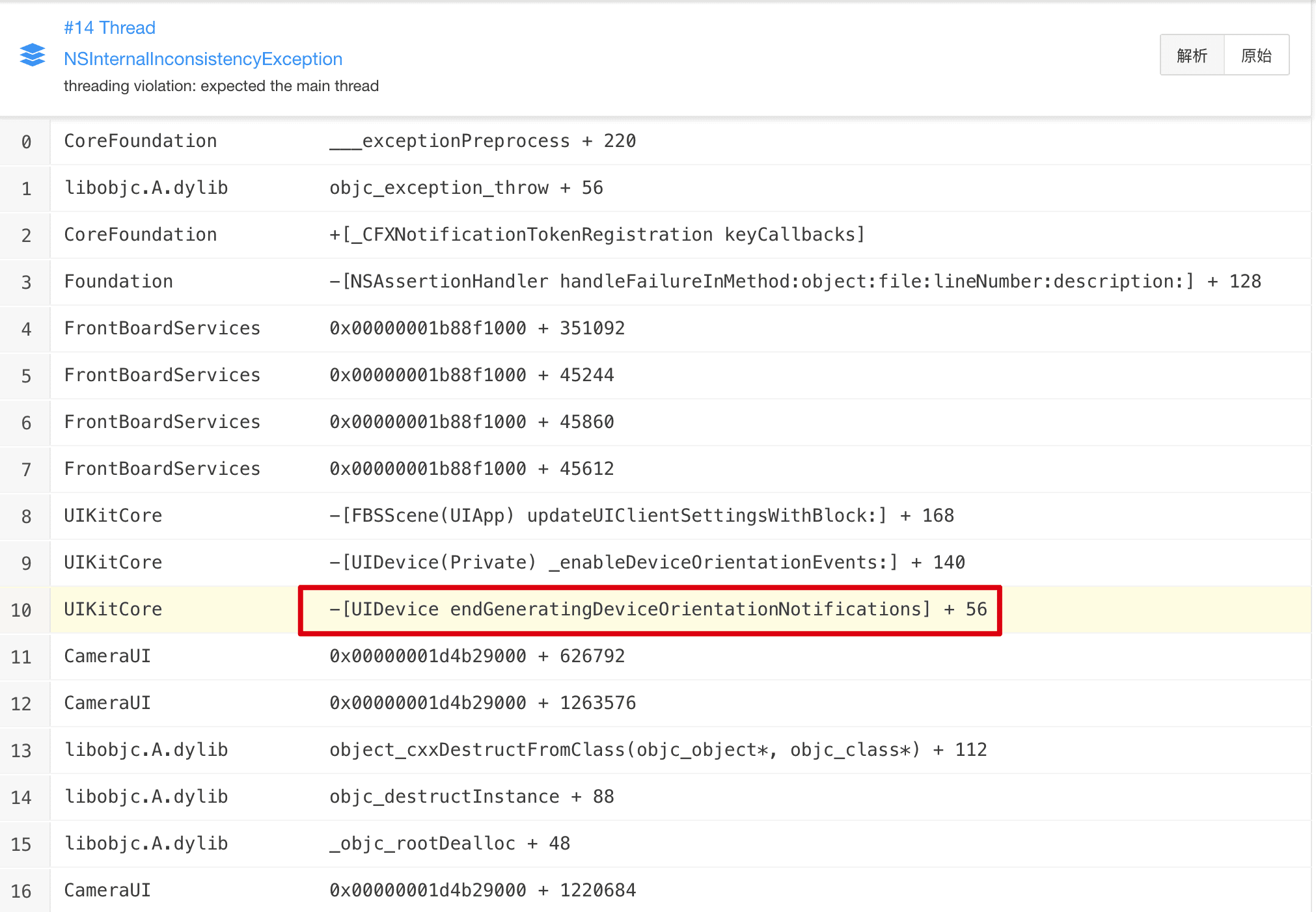 其中的[UIDevice endGeneratingDeviceOrientationNotifications]引起了我的注意,应该是因为某种原因在非主线程调用了这个方法,造成了threading violation。为了验证我的想法,我用hook的方式在调用[UIDevice endGeneratingDeviceOrientationNotifications]时检查当前是否为主线程,结果在某些情况下真的会出现。验证代码如下: