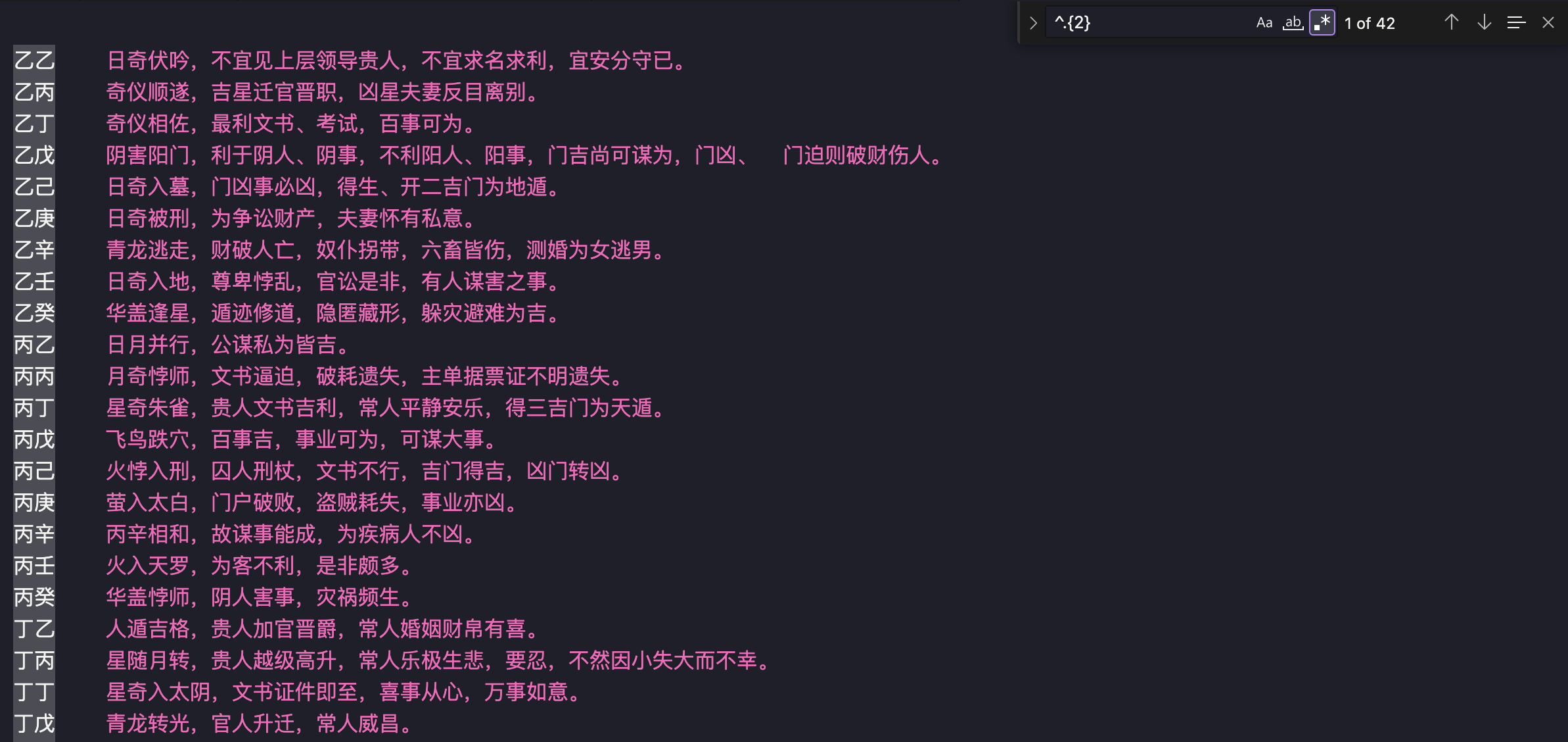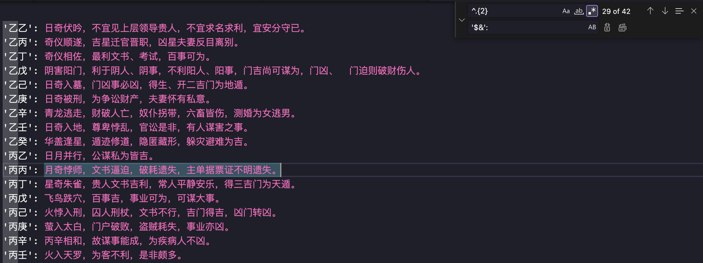 复制-粘贴的格式转化这种体力活首先想到的是用 GPT-4o,但实测在大量数据的情况下精确度是个大问题,要么输出不了那么长的文本,要么数据跟原文档不一致,有时候甚至差得离谱,所以最终还是回到手工处理。当然也不是一段段文字复制粘贴加引号什么的,研究后发现 VS Code 其实可以很好的支持文本正则表达式的查找和替换。